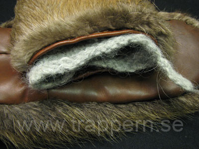 Ett kantband av läder vid handsken avslutar den både snyggt och mycket praktiskt. Livslängden ökar givetvis. En rem finns också för att kunna justera för din egen handled. Spännet är oftast bronsfärgat för att harmonera djuret. Valmöjligheterna är som sagt många och dom kan fås med ett mjukare kalvskinn på insidan. Det gör att handhavandet blir smidigare och känslan högre. Hållbarheten följer däremot inte med. För extremisten så finns alternativet att använda avhårat Bäverskinn på insidan, så att produkten följer den biologiskt rätta gentemot arten som sådan. Handskarna blir då sydda av nästan enbart Bäver, helst självklart av dina egna Bävrar. Visst kan dessa erhållas av mina skjutna djur, men priset måste då reflekteras över. Här anländer mitt undantag. Allt som jag syr, sys med helsyntetisk tråd. Vad jag har kunnat komma fram till så är hållfastheten i denna långt mycket bättre än annat. Speciellt när plagget blir fuktigt. Att tillverka med andra alternativ känns inte bra, när jag vet vad som kan hända och hela produkten kan bli förstörd. Om kunden vill ha annat material i dom momenten så går det givetvis bra. En vuxen Bäver räcker alltså. Om yngre djur används i kombination till kalvskinnet, så blir handskarna mycket smidiga. Två ett åriga Bävrar behövs då. Dom kan visserligen variera i storlek. Men jag har skjutit ett antal som knappt har kommit över tre kilo och då är två ett faktum, per par.
