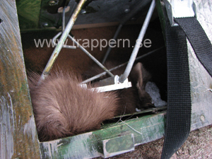 Den här smått unika fällan bygger på helt andra principer än "vanliga" mink och mårdfällor. Det är frågan om en slagplatta av aluminium som kommer ifrån taket med mycket hög kraft, med hjälp utav en fjäder monterad ovanpå fällan. Som de allra flesta fångstmän känner till så används nästan alla andra fällor "slagbygelkonstruktionen", men det gör alltså inte denna. Slagplattan sitter i två svängbyglar, med trampplattan i botten och gillerpinnens fäste i taket. En plastöverdragen vajer är nitad fast i fjädern och sedan förankrad i slagplattan. Däremellan går den över ett kamhjul av plast. Fällan har också ett av marknadens absolut lägsta utlösningstryck, vilket beror på att slagplattan passerar "fjäderns kraftigaste dragläge" och får därför inte speciellt hög dragkraft på sig. Det är vad jag i nuläget vet bara Åke Mångs fälla - Mangs Trap som konkurrerar om detta. Hermelin fångas enkelt, tillsammans med tyvärr också en del småfåglar. Men detta går givetvis att justera, så att i princip bara mink och mård fångas. Fällan rymmer mycket bete och har ett öppningsbart galler på baksidan, som underlättar påfyllning eller byte av det senare. Fällan spänns helt riskfritt upp, för fångstmannens lemmar ifrån utsidan på fällan. Fjädern är fäst i en rejäl bygel som fungerar som en hävarm, och trampplattan med gillerpinne justeras sedan med all säkerhet när säkringspinnen fortfarande sitter kvar. Fjäderns skyddslock och sidoväggens lucka stängs slutligen. Det här är en fälla som jag starkt rekommenderar för alla som bedriver eller tänker börja med fångst av mård, mink eller iller! |